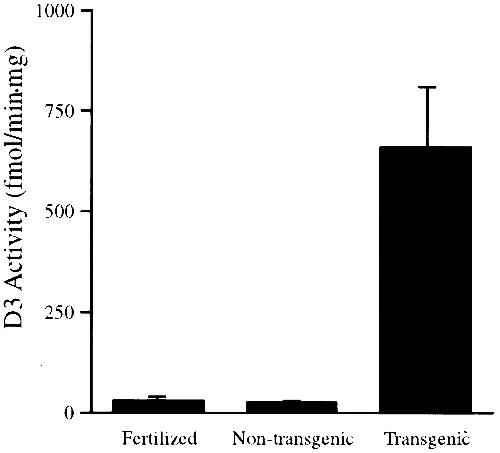 The D3 enzymatic activities in extracts of 1-wk-old normal fertilized, pCS2+GFP-D3 nontransgenic siblings and pCS2+GFP-D3 transgenic tadpoles. Transgenic tadpoles were screened by GFP fluorescence. Values shown are the average of five individual animals in each group. The error bar represents SD.