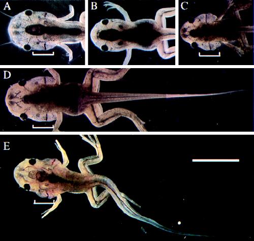 Arrest of pCS2+GFP-D3 transgenic animals at stage 60–61. (A) Control animal, stage 60. (B) Control animal, stage 62. (C, D, and E) Three arrested transgenic animals showing retardation of gill and tail resorption. The brackets indicate the gills. (Bar = 1 cm.)
