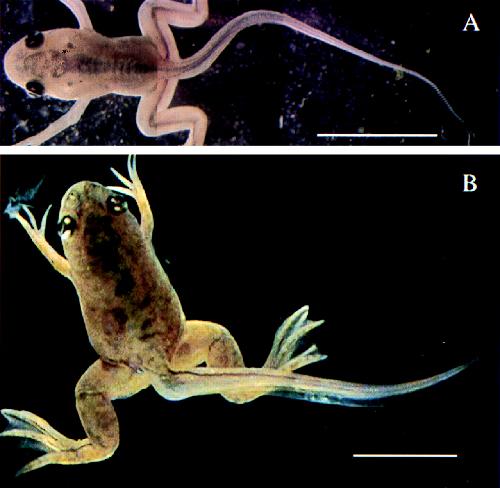 Tailed transgenic frog overexpressing GFP-D3. The animal having just completed gill resorption (A) and the same animal 2 months later (B). (Bar = 1 cm.)
