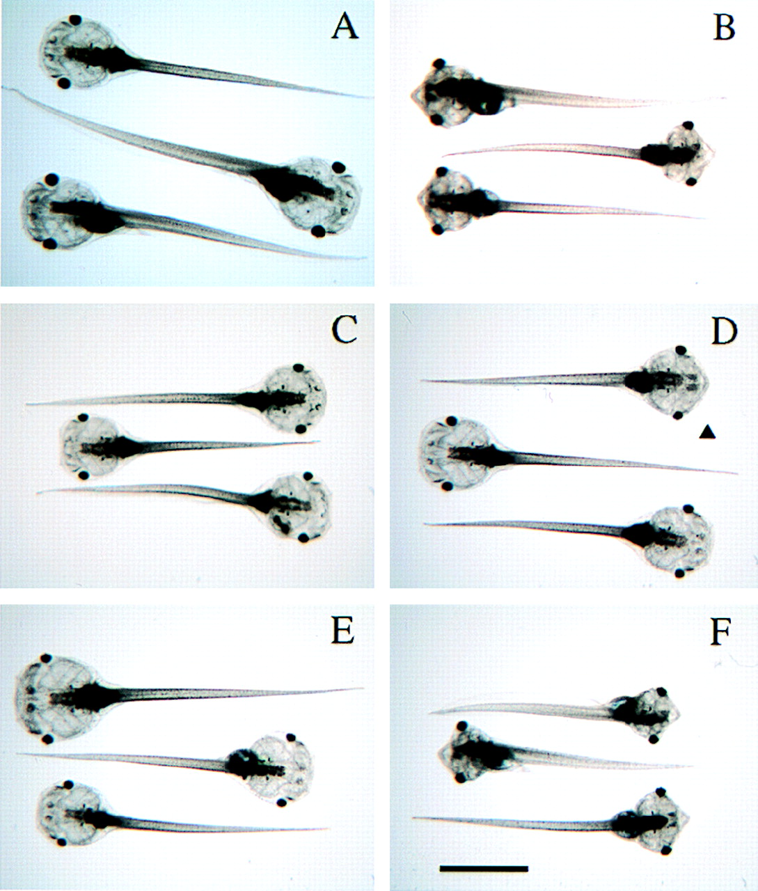 Tadpoles overexpressing GFP-D3 are resistant to exogenous T3. One-week-old tadpoles were screened by using GFP fluorescence and treated with 10 nM T3 for 1 wk. The reshaping of their heads and the protrusion of the lower jaw are the most obvious TH-induced changes. (A) Normal fertilized animals, no T3. (B) Normal fertilized animals treated with T3. (C) pCS2+GFP-D3 transgenic animals, no T3. (D) pCS2+GFP-D3 transgenic animals treated with T3. The arrowhead points to an animal showing partial response as evidenced by slight protrusion of the lower jaw. (E) Nontransgenic siblings, no T3. (F) Nontransgenic siblings treated with T3. (Bar = 4 mm.)