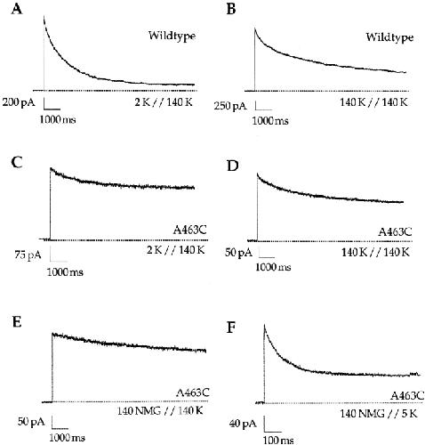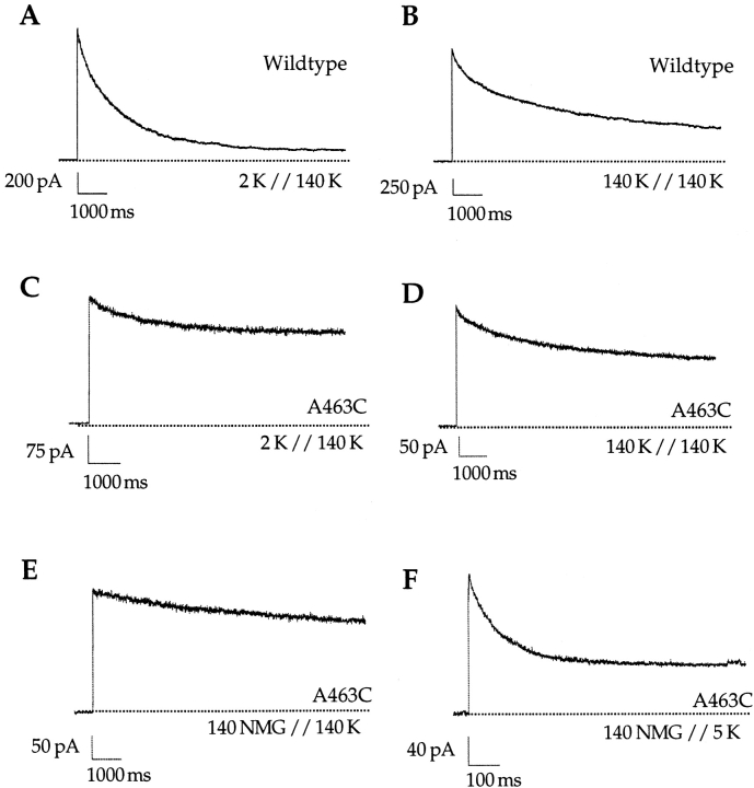 Figure 2. Properties of C-type inactivation with potassium as the conducting ion. Experiments were done in inside-out patches. Current traces were elicited by voltage steps to +50 mV. Except for F, all experiments were performed in the presence of 140 mM internal potassium, and currents were elicited by 10-s voltage steps. Data from the wild-type Shaker channel are shown in A and B, while data from A463C are shown in C–F. (A) The wild-type Shaker channel inactivates with a time constant of 1.4 s in the presence of 2 mM K and 140 mM Na in the external solution. (B) Increasing the external potassium to 140 mM slows C-type inactivation in the wild-type Shaker channel (τ = 2.6 s). (C) C-type inactivation is slow in A463C with 2 mM K and 140 mM Na in the external solutions. Neither increasing the external potassium concentration to 140 mM (D), nor replacing it with external NMG+ (E) has any effect on the time course of C-type inactivation in A463C. However, with 5 mM internal and no external potassium (NMG+), the efflux through the pore is decreased and the A463C channel readily inactivates (F).