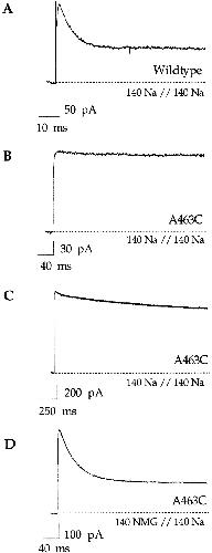 Figure 3. Properties of C-type inactivation with sodium as the conducting ion. All traces were elicited with voltage steps to +100 mV and in the presence of 140 mM internal sodium. Experiments were done in inside-out patches. (A) The wild-type Shaker channel inactivates rapidly (<20 ms) in the absence of added potassium and in the presence of symmetrical 140 mM sodium. Currents were elicited by a 100-ms voltage step. (B) In contrast, no inactivation is observed in the A463C mutant under the same ionic conditions. Currents were elicited by a 400-ms voltage step. (C) A slow decline in current is observed with longer pulses (2,000 ms). (D) In the presence of external NMG+, the A463C mutant rapidly inactivates to a steady state level. Pulse duration was 400 ms.