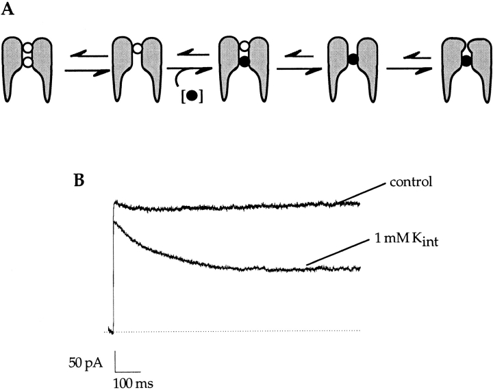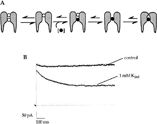 Figure 5. Increased occupancy of the external site of A463C results from decreased repulsive interactions between ions in the pore. (A) A model of the effects of increasing ion occupancy at the internal site on C-type inactivation in symmetrical sodium solutions. Potassium ions are depicted as • and sodium ions as ○. (B) The control trace was elicited by a 1,000-ms voltage step to +100 mV in an inside-out patch in symmetrical 140 mM NaCl. The addition of 1 mM internal potassium results in 13 ± 0.03% block and an increase in the C-type inactivation rate.