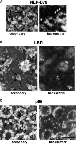 Figure 2. Immunogold electron microscopy reveals the distribution of NEP-B78, LBRx, and p65 between the inner and outer nuclear envelope. Germinal vesicles (GVs) were isolated manually from stage VI oocytes and spread on silicon chips. Using this approach, areas of inner and outer nuclear membrane are both revealed and can be readily distinguished by reference to nuclear pore morphology (Goldberg and Allen, 1992). Spread GVs were labeled with mAb 3E9 (A), rabbit anti-LBR (B), or mAb CEL5C (C) followed by 10-nm gold-conjugated secondary antibodies. Using this approach the distribution of gold labeled antibodies can be detected either in backscatter (revealing white spots corresponding to the position of 10-nm gold; right-hand panels in AâC) or using the secondary electron detector (revealing antibody gold particles of â¼20-nm diam, arrows in left-hand panels in AâC). Bars, 200 nm. |
