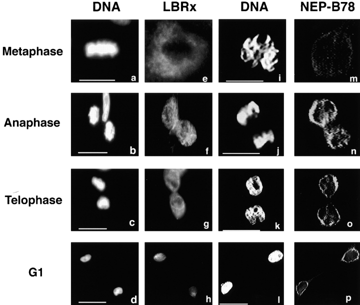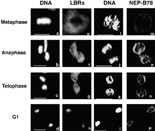 Figure 4. The association of NEP-B78 and LBRx with reforming nuclear envelopes in XLK-2 cells. XLK-2 cells were fixed and stained with either rabbit anti-LBR followed by FITC goat anti–rabbit Ig (a–h) or mAb 3E9 followed by FITC-goat anti– mouse Ig (i–m). Fluorescence images of cells in metaphase (a, e, i, and m), anaphase (b, f, j, and n), telophase (c, g, k, and o) or early G1 (d, h, i, and p) were collected with a 12 bit CCD camera attached to a Zeiss Axioskop microscope. In each pair of micrographs, the distribution of DNA is revealed by DAPI staining (a–d and i–l). Bars, 10 μm. |