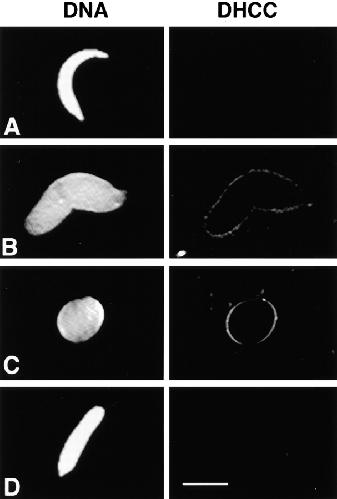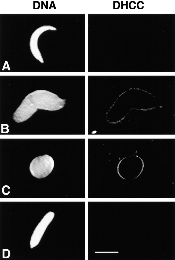 Figure 5. Reconstitution of NE assembly with purified particulate fractions. Demembranated sperm was incubated in cytosol with the addition of MP1 (A), MP2 (B), MP1+ MP2 l (C), or no additions (D) for 90 min at room temperature. Samples were processed for fluorescence microscopy (see Materials and Methods). In each case the left-hand panel shows DNA visualized with Hoechst 33258 and the right-hand panel shows the same sperm stained with 3,3′-dihexyloxocarbocyanine (DHCC) to reveal membranes. Bar, 10 μm. |