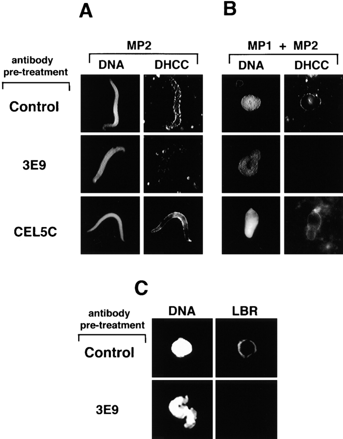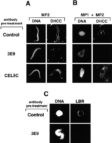 Figure 10. Effect of NEP-B78 and p65 mAbs on vesicle recruitment and nuclear assembly. Aliquots of MP2 membranes were incubated with either anti-cytokeratin 18 mAb (CK-18) as control or anti-NEP-B78 mAB 3E9 or the anti-p65 mAb CEL5C and reisolated as described in Materials and Methods. (A) Vesicle recruitment assays were performed using demembranated sperm chromatin and cytosol supplemented with indicated antibody- treated MP2 alone. (B and C) NE assembly assays were performed using sperm chromatin, cytosol plus MP1 and indicated antibody-treated MP2. In A and B, DNA was stained with Hoechst 33258 (left-hand panels) and membranes are stained with DHCC (right-hand panels). In (C) MP2 previously treated with control CK-18 mAb or 3E9 was incubated with cytosol, MP1 and sperm chromatin, fixed for immunofluorescence and probed for the presence of LBRx using an FITC-labeled secondary antibody. Left-hand panels show DNA stained with DAPI with corresponding fluorescein-labeled images to the right. |