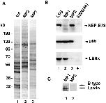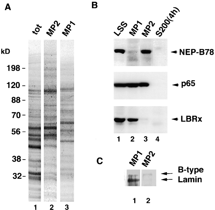 Figure 7. Biochemical characterization of MP1 and MP2 fractions; localization of NEP-B78, p65, LBRx, and B-type lamins in egg extract fractions. (A) Total egg extract was subjected to fractionation by centrifugation as described (Smythe and Newport, 1991) to produce a total NE precursor membrane fraction (tot) or as described in (Vigers and Lohka, 1991) to yield MP1 and MP2 fractions. Equal protein loadings of each fraction were subjected to SDS-PAGE and stained with Coomassie blue. (B) Total egg extract (LSS) was subjected to fractionation by centrifugation as described (Vigers and Lohka, 1991) to yield MP1 and MP2 fractions and a membrane-free cytosol (S2004h). Volumes of each fraction, proportional to that found in a single egg, were resolved on an 8% polyacrylamide gel and subjected to immunoblotting for NEP-B78 (top) using mAb 4G12, p65 (middle), or LBRx (bottom). In each case, lane 1 contains low speed supernatant (LSS) and lanes 2â4 contain MP1, MP2 and cytosol, respectively. (C) MP1 and MP2 fractions were resolved on a 10% gel and subjected to immunoblotting for B-type lamins using the mAb L6 8A7. |