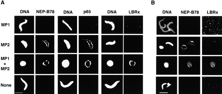 In this work, we have used novel mAbs against two proteins of the endoplasmic reticulum and outer nuclear membrane, termed NEP-B78 and p65, in addition to a polyclonal antibody against the inner nuclear membrane protein LBR (lamin B receptor), to study the order and dynamics of NE reassembly in the Xenopus cell-free system. Using these reagents, we demonstrate differences in the timing of recruitment of their cognate membrane proteins to the surface of decondensing chromatin in both the cell-free system and XLK-2 cells. We show unequivocally that, in the cell-free system, two functionally and biochemically distinct vesicle types are necessary for NE assembly. We find that the process of distinct vesicle recruitment to chromatin is an ordered one and that NEP-B78 defines a vesicle population involved in the earliest events of reassembly in this system. Finally, we present evidence that NEP-B78 may be required for the targeting of these vesicles to the surface of decondensing chromatin in this system. The results have important implications for the understanding of the mechanisms of nuclear envelope disassembly and reassembly during mitosis and for the development of systems to identify novel molecules that control these processes.