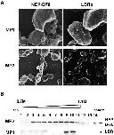 Figure 8. Characterization of NEP-B78- and LBRx-containing vesicles in MP2 and MP1 fractions by (A) immunogold labeling and FEISEM and (B) sucrose density gradient centrifugation. (A) MP1 (top panels) or MP2 vesicles (bottom panels) were isolated on silicon chips, fixed with 4% paraformaldehyde and 0.1% glutaraldehyde and labeled with either mAb 3E9 followed by 10-nm gold–conjugated sheep anti–mouse Ig (left-hand panels) or rabbit anti–LBR followed by 10-nm gold–conjugated sheep anti–rabbit Ig (right-hand panels). Samples were imaged on a Topcon DS130F scanning electron microscope using both secondary electron and backscatter detectors. The micrographs displayed in A show backscatter images superimposed over secondary images. Before superimposition, the backscatter images were chromatically inverted so that 10-nm gold particles appear as black dots. (B) Aliquots of MP1 and MP2 were overlaid with a sucrose density gradient and subjected to centrifugation as described in Materials and Methods. 14 fractions were retrieved, from the top of the centrifuge tube (lane 1) to the bottom (lane 14), and analyzed by SDS-PAGE and Western blotting for the presence of NEP-B78 (top) using mAb 3E9 or LBR (bottom). Bars, 200 nm. |