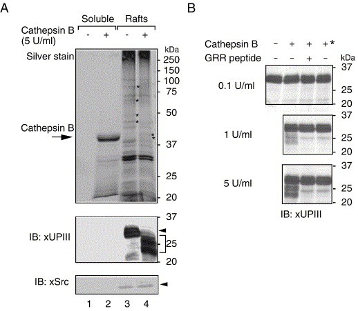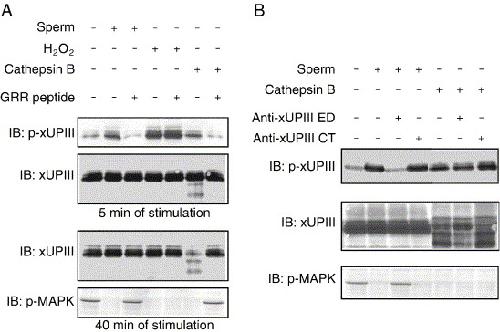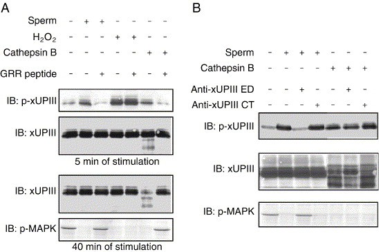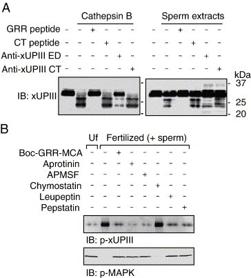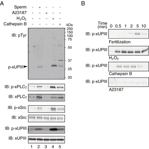 In a previous study, we identified Xenopus egg uroplakin III (xUPIII), a single-transmembrane protein that localized to lipid/membrane rafts and was tyrosine-phosphorylated upon fertilization. An antibody against the xUPIII extracellular domain abolishes fertilization, suggesting that xUPIII acts not only as tyrosine kinase substrate but also as a receptor for sperm. Previously, it has been shown that the protease cathepsin B can promote a transient Ca2+ release and egg activation as seen in fertilized eggs (Mizote, A., Okamoto, S., Iwao, Y., 1999. Activation of Xenopus eggs by proteases: possible involvement of a sperm protease in fertilization. Dev. Biol. 208, 79-92). Here, we show that activation of Xenopus eggs by cathepsin B is accompanied by tyrosine phosphorylation of egg-raft-associated Src, phospholipase Cgamma, and xUPIII. Cathepsin B also promotes a partial digestion of xUPIII both in vitro and in vivo. A synthetic xUPIII-GRR peptide, which contains a potential proteolytic site, inhibits the cathepsin-B-mediated proteolysis and tyrosine phosphorylation of xUPIII and egg activation. Importantly, this peptide also inhibits sperm-induced tyrosine phosphorylation of xUPIII and egg activation. Protease activity that digests xUPIII in an xUPIII-GRR peptide-sensitive manner is present in Xenopus sperm. Several protease inhibitors, which have been identified to be inhibitory toward Xenopus fertilization, are shown to inhibit sperm-induced tyrosine phosphorylation of xUPIII. Uroplakin Ib, a tetraspanin UP member, is found to be associated with xUPIII in egg rafts. Our results highlight novel mechanisms of fertilization signaling by which xUPIII serves as a potential target for sperm protease essential for fertilization.