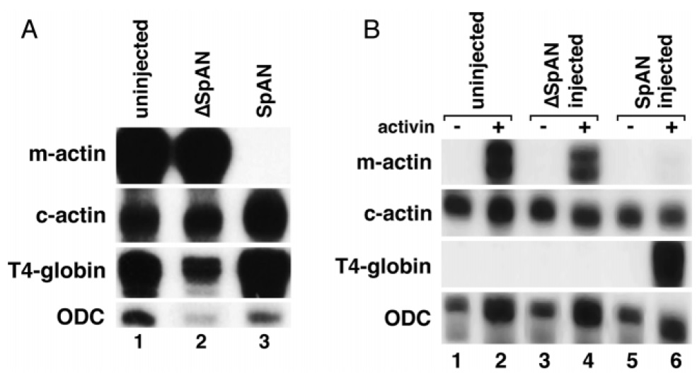 and aT4-globin. The results show that SpAN ventralizes the mesoderm in activin-treated caps, lowering the expression of muscle a-actin