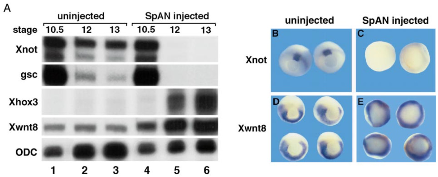 FIG. 2. SpAN ventralizes dorsal mesoderm. (A) Total RNA isolated from uninjected embryos and embryos injected with 1.6 ng of either