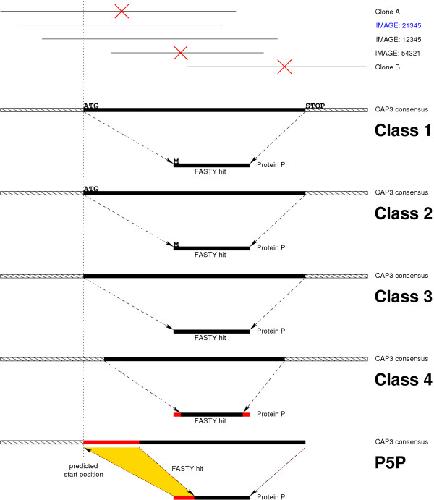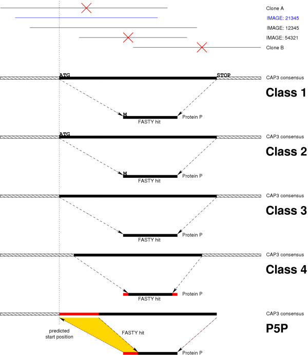 Figure 1. Full length clone selection (top) and TC categories (bottom). ESTs derived from different clones were clustered and assembled. The CAP3 contig was compared to protein databases using BLASTX and FASTY and hits categorized in 4 categories. Class 1 hits had to match the whole protein sequence and start with an ATG in the TC and M in the protein and the hit had to end at a STOP codon. Class 2 hits had to match the whole protein sequence, start with an ATG in the TC and M in the protein. Class 3 had to match the full protein sequence (without further restrictions), class 4 had to cover the protein over almost its full length, allowing the match to start or end maximal 10 ten amino acids after/before the start or end of the protein. Predicted 5' TCs (P5P) had to have enough sequence to fill up the missing 5' end of the protein sequence. Clone selection: Clone A and B were discarded because of missing IMAGE id. Clone 54321 does not span 5' end of protein match. Clone 21345 was selected as most 5' clone fulfilling the requirements.