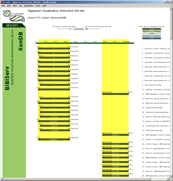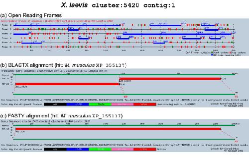 Figure 5. Cluster view of the XenDB Web interface. Best FASTY hits to NR protein database, five model organisms and Xenopus proteins are shown on top. Gene Ontologies (GO) are based on best human and mouse IPI hits, functional categories on hits to COG and KOG databases. Below, additional information for each EST in the cluster is shown, such as accession, UniGene and TGI id, clone, cell and tissue type. Clones predicted not to be full length are colored red. Links to CAP3 assembly and TC sequence are provided.