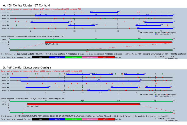Figure 4. Two examples of TCs derived from clones predicted to have a full length insert (P5P). The start positions in the hit suggest that the unmatched amino-terminal protein sequence is not well conserved between X. laevis and the matched organisms, here rabbit (top) and human (bottom), but the open reading frames (blue boxes) indicate that the clones the sequences were derived from do actually contain a full length insert. (Screenshots of the results were generated by the Genlight system.)