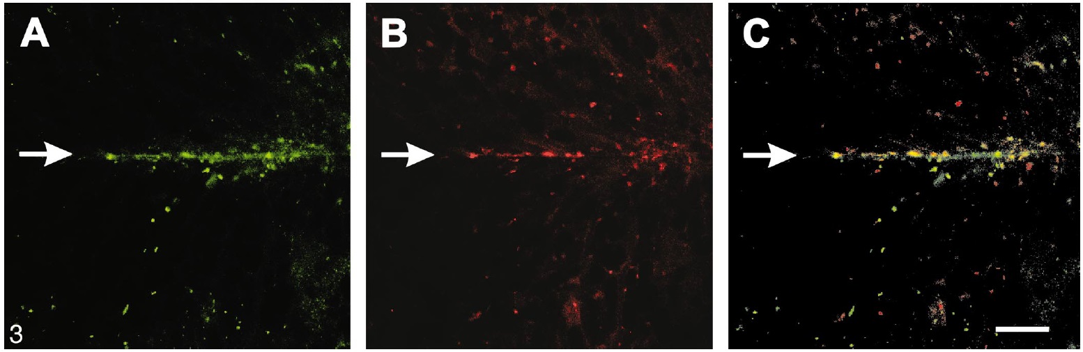 (yellow). Arrows indicate synaptic regions adjacent to the myotomal septum. Bar, 20 mm.