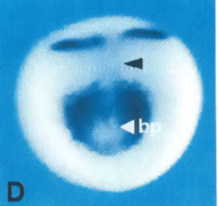 fgf3 (ibroblast growth factor 3) gene expression in the posterior axial mesoderm around the the closed blastopore (bp), referred to as the circumblastorporal collar, in a X. laevis embryo, NF stage 14,