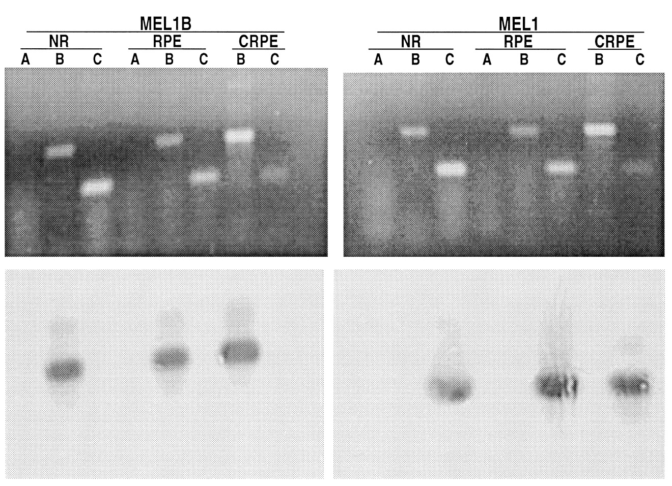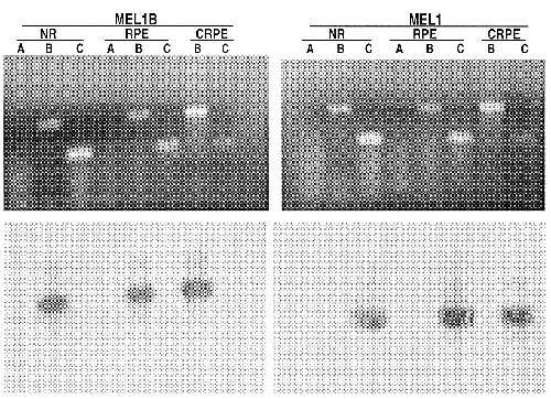 was probed with the MEL1C riboprobe. The MEL1B riboprobe hybridizes only with MEL1B PCR bands, and the MEL1C riboprobe hybridizes only with