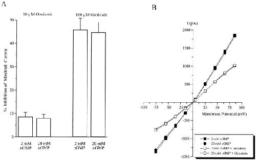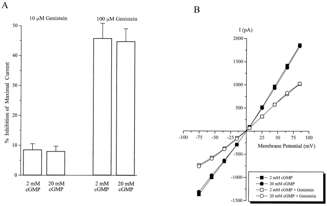 Figure 4. Genistein inhibition is not competitive with respect to cGMP and is not voltage dependent. (A) Inhibition of steady state CNG current by 10 and 100 μM genistein. Note that the percent inhibition of the maximal current does not change when cGMP is increased from 2 to 20 mM. (B) Current–voltage curves of CNG current activated by saturating cGMP (2 and 20 mM) in the presence and absence of 100 μM genistein. n = 5–8 patches for each experiment.