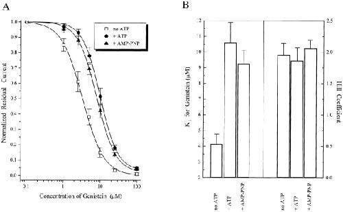 Figure 5. Competitive effects of ATP and AMP-PNP on genistein inhibition. (A) Dose– inhibition curves for genistein alone (n = 13), genistein plus 200 μM ATP (n = 7), and genistein plus 200 μM AMP-PNP. Continuous curves show fits to the Hill equation. (B) Histogram showing Ki and Hill coefficient values for genistein inhibition curves. Data represents mean ± SEM for all individual experiments included in A. Note that ATP and AMP-PNP increase the Ki for genistein without affecting the Hill coefficient.