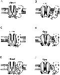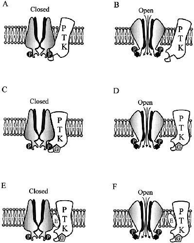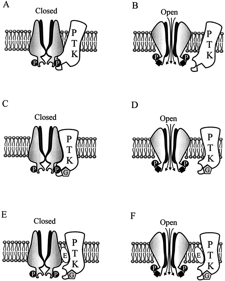 Figure 9. Schematic diagram of genistein inhibition. (A) The closed channel is loosely associated with a PTK that can catalyze phosphorylation, whereas the open channel (B) is not. Genistein stabilizes the interaction between the PTK and the closed channel, causing inhibition (C), whereas PTK remains unbound from the open channel (D). Erbstatin destabilizes the interaction between the PTK and the channel, decreasing genistein inhibition of the closed channel (E) and eliminating genistein inhibition of the open channel (F). Genistein is depicted as a pentagram labeled G, erbstatin is depicted as an oval labeled E, P represents tyrosine phosphorylation sites on the channel, and the black squares represent ligand (cGMP).