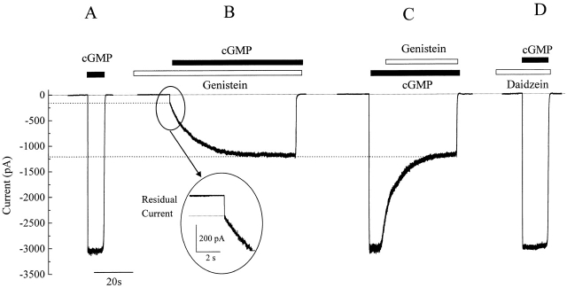Figure 2. Genistein slows activation and reduces maximal current through rod CNG channels. (A) Response of rod CNG channels in an excised patch to saturating (2 mM) cGMP. (B) Response to saturating cGMP after preexposure to 100 μM genistein for 1 min. Inset shows residual current not inhibited by genistein. (C) Partial inhibition of maximal CNG current activated by saturating cGMP. (D) The inactive genistein analogue daidzein has no effect on the maximal current.