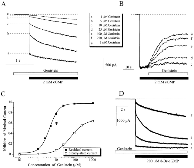 Figure 3. Closed channels are more sensitive to genistein inhibition than are activated channels. (A) Inhibition of closed channels by preexposure to various concentrations of genistein for 1 min. Closed channels were activated by application of 2 mM cGMP. Residual currents at five different genistein concentrations are indicated by dotted lines, and the genistein concentrations are indicated by letter to the right of each trace. In A, B, and D, the letter refers to the genistein concentration key. Note that the amplitude of the residual current is inversely proportional to the genistein concentration. (B) Inhibition of steady state CNG current, maximally activated by saturating cGMP (2 mM). The effects of five different genistein concentrations are indicated by letter to the right of each trace. (C) Dose–inhibition curves of the effect of genistein on closed (residual current as in A) and maximally activated channels (steady state current, as in B). Continuous curves show fits of the data to the Hill equation (see materials and methods). The asterisk depicts inhibition of current activated by saturating cGMP, after preexposure to genistein (10 μm) in conjunction with a saturating concentration of cAMP (20 mM). Note that preexposure to cAMP has only a minor effect on genistein inhibition (n = 6 experiments). (D) Inhibition of native CNG channels from salamander rod outer segments after preexposure to various concentrations of genistein for 1 min. The effects of four different genistein concentrations are indicated by letter to the right of each trace.