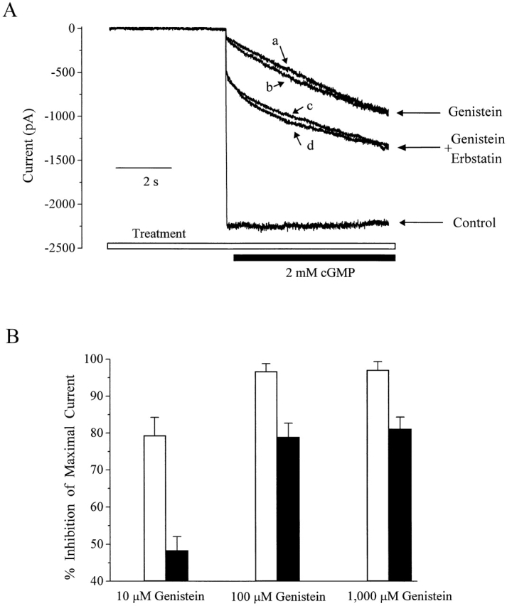 Figure 7. Effect of erbstatin on genistein inhibition of closed channels. (A) CNG current activated by saturating (2 mM) cGMP alone (control) or after preexposure to 100 (a and c) or 1,000 (b and d) μM genistein. Preexposure to 100 μM erbstatin, as indicated, partially inhibits the effect of genistein. (B) Summary data for genistein inhibition alone (open bars) and with erbstatin (filled bars). n = 5 for each condition.