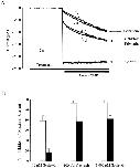 Figure 8. Effect of erbstatin on genistein inhibition of maximally activated channels. (A) Genistein (100 μM) inhibition of CNG current activated by 2 mM cGMP in the absence and presence of 100 μM erbstatin. (B) Summary data for genistein inhibition alone (open bars) and with erbstatin (closed bars). n = 5–8 for each condition.