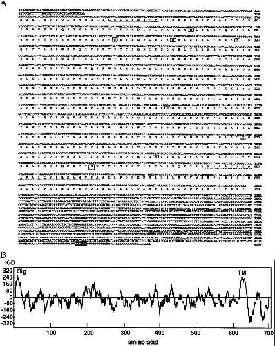 The XNLRR-1 cDNA sequence predicts a glycosylated transmembrane protein. (A) cDNA sequence and deduced amino acid sequence of XNLRR-1. Poly(A) adenylation signal sequence (AATAAA) is highlighted. The putative hydrophobic signal sequence and transmembrane region are marked by underlines and dotted underlines, respectively. Potential N-linked glycosylation sites are highlighted in the square box. (B) Hydrophobicity analysis (Kyte and Doolittle, 1982) of the predicted amino acid sequence of XNLRR-1 with a window of five residues indicating the N-terminal and C-terminal hydrophobic stretches, characteristic of signal sequence and transmembrane region, respectively. The hydrophobic stretches appear as positive values. Both regions are indicated. Sig, signal sequence; TM, transmembrane.