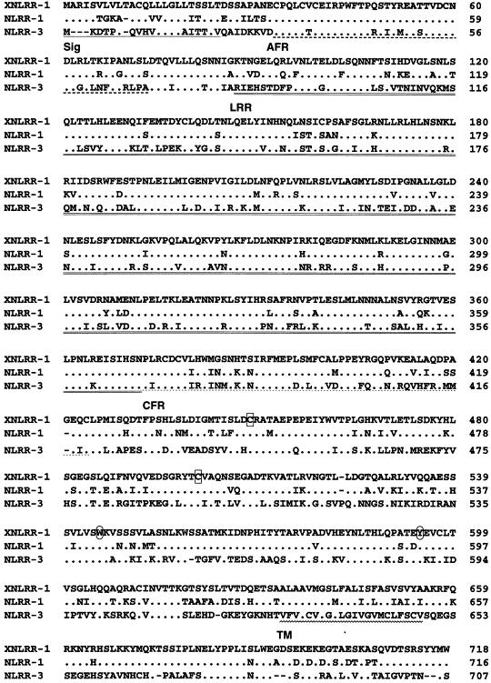 Amino acid sequence comparison of XNLRR-1 with NLRR-1 and NLRR-3. XNLRR-1 shares 80% amino acid identity with NLRR-1 and 51% identity with NLRR-3. Identical amino acids are indicated by dots, and spaces (dashes) have been introduced to maximize the homology. The putative signal sequence is underlined. The LRR domains are double-underlined. The AFR and CFR are marked by a dashed line and dotted line, respectively. Square boxes indicate the conserved cysteins of Ig domains. Circles indicate tyrosine and tryptophan residues that are characteristic of FN III repeats. Transmembrane regions are wave-underlined.