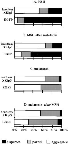 Figure 2. Quantitative analysis of pigment distribution in cells transfected with either control DNA (pEGFP-C1) or headless Xklp3 (pEGFP-headless Xklp3). Melanophores were transfected by electroporation and plated on coverslips, and after 72 h of expression, cells were incubated in serum-free medium containing MSH (A) or melatonin (C) for 1 h. In sequential treatments (B and D), cells were incubated for 1 h in melatonin followed by 1 h in MSH (B) or vice versa (D). The horizontal axis shows the percentage of cells that were scored as aggregated (white), partially dispersed (gray), or dispersed (black). For each treatment, 100 cells were scored. Data shown here are representative from one of four independent experiments.