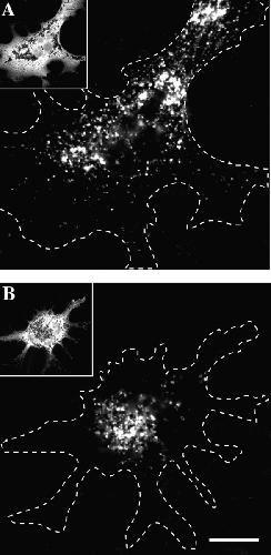 Figure 6. Distribution of lysosomes is not affected in melanophores overexpressing headless Xklp3. Cells exhibit normal lysosomal movement in response to changes in pH (dispersed in acidic conditions, clustered in alkaline conditions). Upon treatment with low pH, lysosomes redistribute through the entire cytoplasm (A). Normal perinuclear distribution is reestablished upon treatment with high pH (B). Transfected cells expressing the EGFP-headless Xklp3 fusion protein are shown in the insets, while in the large pictures the cell outlines are traced, and lysosomes stained with Texas red dextran are shown. Bar, 20 μm.