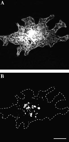 Figure 7. SUK4 inhibits dispersion of lysosomes but does not affect melanosomes. Melanophores with labeled lysosomes were injected with SUK4 and then exposed to acidic conditions in presence of MSH. Injected cells were identified by staining with a rhodamine anti–mouse antibody. (A) Overlay of bright field and fluorescence images, showing that melanosomes are normally dispersed in an injected cell. (B) Clustered distribution of lysosomes, labeled with FITC-dextran, in acidic conditions. Instead of normally dispersed through the cytoplasm, they remain clustered in the cell center. Bar, 20 μm.