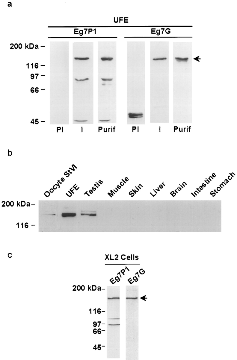 Figure 2. Expression of pEg7. (a) Pattern of the proteins revealed by antiâpEg7 P1 and antiâpEg7 G antibodies. Protein samples corresponding to one unfertilized egg were separated by SDS-PAGE and transferred onto nitrocellulose. The blots were probed with preimmune serums, immune serums, or purified antibodies as indicated. Positions of the molecular weight markers are indicated at the left. The position of pEg7 is indicated by an arrow. (b) Tissue expression of pEg7. Protein samples (40 μg) from each different tissue were separated by SDS-PAGE, transferred to a nitrocellulose filter, and probed with purified antiâ pEG7 P1 antibodies. (c) Expression of pEg7 in Xl2 culture cells. Protein samples corresponding to 1.6 à 105 cells were processed as described above and probed with purified antiâpEg7 P1 or antiâpEg7 G antibodies as indicated.