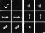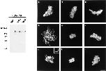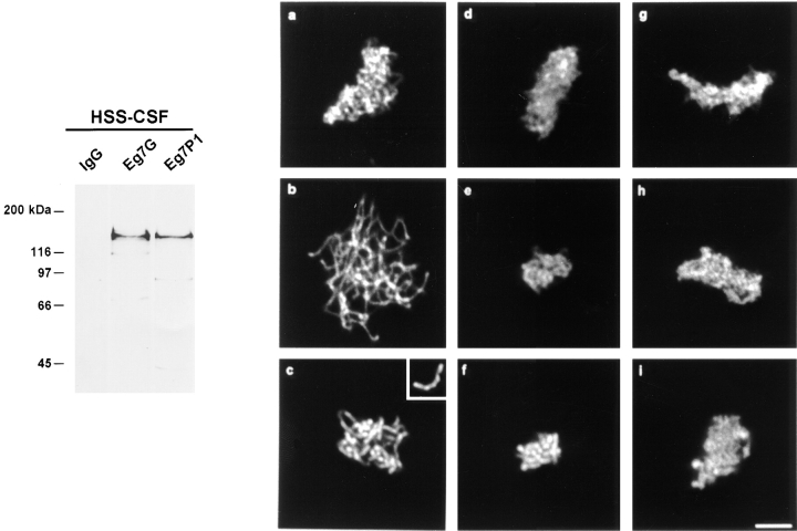 Figure 5. pEg7 is required for assembly of mitotic chromosomes in vitro. (Left) Samples from high-speed mitotic extracts (1 μl) were separated by SDS-PAGE, transferred to a nitrocellulose filter, and probed with nonimmune immunoglobulins, purified anti–pEg7 P1 or purified anti–pEg7 G antibodies as indicated. (Right) Chromosomes were assembled in the presence of IgG (a–c), purified anti–pEg7 G antibodies (d–f), or purified anti–pEg7 P1 antibodies (g–i). Samples were taken at different time points and fixed. DNA was stained with ethidium bromide: (a, d, and g) 30 min, (b, e, and h) 60 min, (c, f, and i) 120 min. Bar, 5 μm.