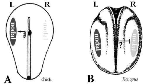 Recent experiments have suggested a pathway of genes that regulate left-right asymmetry in vertebrate embryogenesis. The most downstream member of this cascade is nodal (XNR-1 in frogs), which is expressed in the left-side lateralmesoderm. Previous work in the chick [Levin, 1998] suggests that an inductive interaction by Shh (Sonic hedgehog) present at the midline was needed for the left-sided expression of nodal, which by default would not be expressed. Interestingly, it has been reported [Lohr et al., 1997] that in Xenopus, right-side mesoderm that is explanted at st. 15 and allowed to develop in culture, goes on to express nodal, suggesting that lateralmesoderm expresses this gene by default and that a repression of nodal by the midline is needed to achieve asymmetry. Such a contradiction raises interesting questions about the degree of conservation of the mechanisms upstream of nodal asymmetry and, in general, about the differences in the LR pathway among species. Thus we examined this issue directly. We show that in the chick, as in the frog, explanted mesoderm from both sides does, indeed, go on to express nodal, including both the medial and lateral expression domains. Ectopic nodal expression in the medial domain on the right side is not sufficient to induce an ectopic lateral domain. We also show that explanted lateraltissue regenerates node/notochord structures exhibiting Shh expression. Furthermore, we show that Xenopus explants done at st. 15 also regenerate notochord by the stage at which XNR-1 would be expressed. Thus explants are not isolated from the influence of the midline. In contrast to the midline repressor model previously suggested [Lohr et al., 1997] to explain the presence of nodal expression in explants, we propose that the expression is due to induction by signals secreted by regenerating node and notochordtissue (Shh in the chick). Thus our results are consistent with Shh being necessary for nodal induction in both species, and we provide an explanation for both sets of data in terms of a single conserved mechanism upstream of nodal expression.