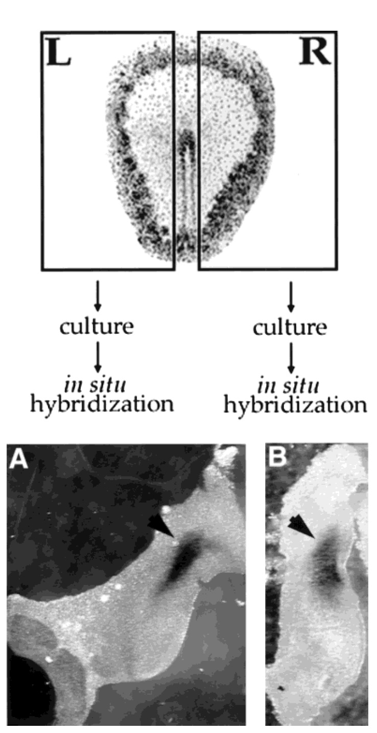 Fig. 4. Chick explants regenerate node without correct LR asymmetry. A. Left and right explants, when cultured for 10–20 hours, exhibit Shh