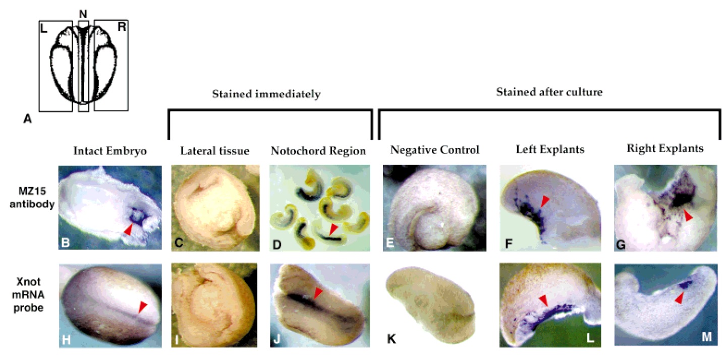 Fig. 5. Nodal does not induce nodal. A. In intact embryos, there are two domains of nodal expression: a small medial domain (M arrowhead)