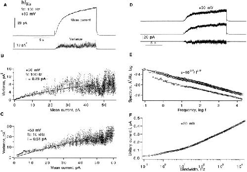 Figure 2. Fluctuation analysis of hIKs currents. (A) Mean current and time-dependent variance computed from 30 sweeps filtered at 100 Hz. The current was induced by +50-mV depolarizing pulses from a −80 mV holding potential in a cell-attached patch recording. Pulses were delivered every 32 s. (B) Mean–variance plot of 100 Hz–filtered currents. A fit of Eq. 1 yields unitary current iv = 0.28 pA and number of channels (n) = 368; the corresponding apparent open probability Pmax = 0.43. (C) Mean–variance plot from a total of 20 sweeps at 10 kHz bandwidth from the same patch. In this case, 12-s depolarizations to +50 mV were delivered every 32 s. The fit yields iv = 0.51 and Pmax = 0.24. (D) A pair of successive current traces and their difference filtered at 1 kHz; same set of data as in A. (E) The top trace is the resulting power spectrum of currents from 30 sweeps after correction for background noise. The contribution Sshot from ion transport during channels opening was estimated according to Sshot = 2e0I = 1.4 · 10−29 A2/Hz and was subtracted. The solid line indicates a power-law fit S(f) = 10−24/f 0.9 A2/Hz. The mean current was 45 pA, and the unitary current estimate is = 0.47 pA at 20 kHz bandwidth. The lower trace shows the spectrum (values plotted one decade lower in the graph for clarity) computed from another representative data set, where the mean current was 39 pA; the unitary current is = 0.44 pA at 20 kHz. (F) Dependence of apparent unitary current is (Eq. 3) on filter cut-off frequency at +50 mV. Variance was calculated from the numeric integral of the power spectrum over the frequency range 0.1 Hz–10 kHz. |