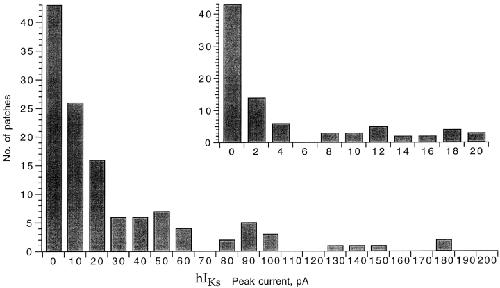 Figure 3. Frequency distribution of hIKs patch currents. Current was measured at the end of a 5-s depolarization to +50 mV in each of 128 patches, and histograms were constructed. The inset shows an expanded histogram, where the bin at zero represents the 43 patches that showed no IKs current. |