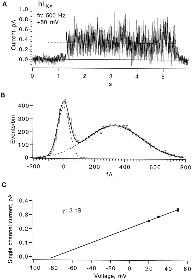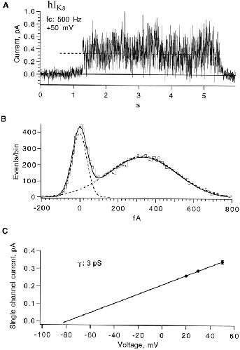 Figure 4. Single-channel hIKs current. (A) One sweep showing a putative hIKs single-channel opening, recorded from a three-channel patch at +50 mV. Data were filtered at 500 Hz. (B) All-points amplitude histogram, which yields an apparent unitary current 0.34 pA (indicated by the dashed line in A). (C) Single channel currents estimated from amplitude histograms at 200 Hz bandwidth (n = 4 for +50 mV, n = 1 for other voltages). A linear fit yields 3 pS for the single-channel conductance. |
