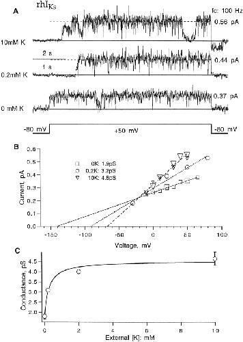Figure 10. Single-channel conductance of rIKs channels with different external K+ solutions. (A) Representative current traces induced by +50-mV depolarizing pulses from −80-mV holding potential. Data were filtered at 100 Hz. (B) Single-channel current as a function of voltage obtained from double-Gaussian fits to amplitude histograms of traces. Fitted lines have slopes of 1.9, 3.2, and 4.8 pS for 0, 0.2, and 10 mM external K+, respectively. (C) External potassium dependence of single channel conductance. Error bars represent SEM (n = 2 for 0 mM and n = 4 for 10 mM; the points at 0.2 and 2 mM K+ are single observations). The superimposed fit is the function γ = 1.8 + 2.8/(1 + 0.5 mM/[K]) pS. |