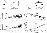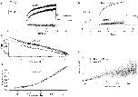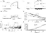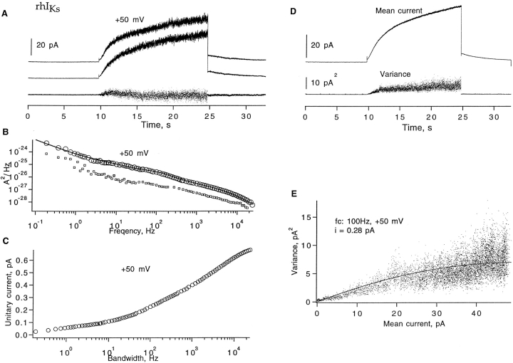Figure 6. Fluctuation analysis of rhIKs currents. (A) A pair of successive current traces, filtered at 1 kHz. The current was induced by +50-mV depolarizing pulses from −80-mV holding potential, and repolarized to –60 mV in a cell-attached patch recording with 140 mM K-aspartate, 1 mM EGTA, 10 mM HEPES, pH 7.4 in the bath; 96 mM NaCl, 2 mM KCl, 1 mM MgCl2, 0.1 mM CaCl2, 5 mM HEPES in the pipette. Pulses were delivered every 33 s; mean current during the depolarizing pulse was 34 pA. (B) The corrected power spectrum of currents, computed from 36 traces. The solid curve is a fitted power-law function plus four Lorentzian components, of the form S = 1.1 · 10−29 + 6.1 · 10−25/f 1.2 + 6 · 10−26/[1 + (f/11)2] + 2.9 · 10−27/[1 + (f/141)2] + 2.2 · 10−27/[1 + (f/1,195)2] + 8.8 · 10−28/[1 + (f/3,535)2], where f is in Hz and S is in A2/Hz. The unitary current is = 0.67 pA at 20 kHz bandwidth. The lower trace is the spectrum from another recording in which the mean current was 7 pA and is = 0.51 pA at 20 kHz. (C) Frequency dependence of unitary current calculated from the numeric integral of power spectrum over the frequency range 0.1 Hz–20 kHz. (D) Ensemble mean current and variance, from the same data filtered at 100 Hz. The variance trace was calculated from pairs of sweeps to minimize error due to drift. (E) Mean–variance plot. Superimposed is a parabolic fit, which yields the unitary current estimate iv = 0.28 pA. |