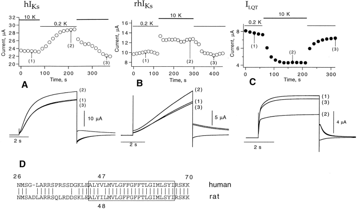 Figure 9. Effect of extracellular potassium on peak current of hIKs, rhIKs, and ILQT in the two-electrode voltage clamp. (A) Magnitude of hIKs current at the end of 5-s depolarizations to +30 mV as the bath solution was switched between 0.2 and 10 mM K+. The lower panel shows current traces corresponding to the times indicated at top. (B) rhIKs current; (C) ILQT current; (D) the amino acid sequences of human and rat minK in the vicinity of the putative transmembrane region (box). |