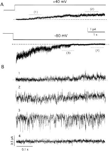 Figure 2. Single-channel activity recorded from an inside-out patch containing a few wild-type IKs channels in symmetrical 100-mM KCl solution. (A) Current activation at 40 mV from a holding voltage of −80 mV. (B) Current deactivation on return to −80 mV. Expanded traces 1–4 are from the indicated portions of A and B. Data were sampled at 4 kHz and filtered at 1 kHz.