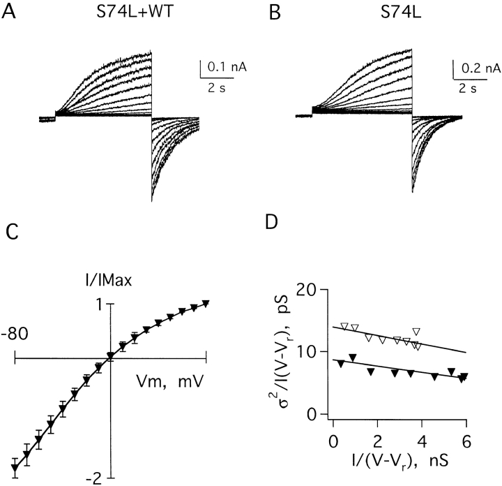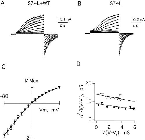 Figure 7. Current–variance relationships of IKs channels formed with wild-type and S74L minK subunits. (A) Family of currents recorded in a patch excised from an oocyte coinjected with KvLQT1 cRNA and a 1:1 mixture of wild-type and S74L minK cRNAs. The patch was clamped at −60 mV and depolarized from −20 to 100 mV in steps of 10 mV. (B) Family of currents recorded from oocytes coinjected only with KvLQT1 and S74L minK cRNAs. The protocol was as in A with steps from −20 to 90 mV. (C) Current–voltage relationship of peak tail currents measured for S74L IKs channels, mean ± SEM for three patches. (D) Current–variance relationships computed from the patches in A (▿) and B (▾); the conductances calculated in these patches were 14 and 8.7 pS, respectively.