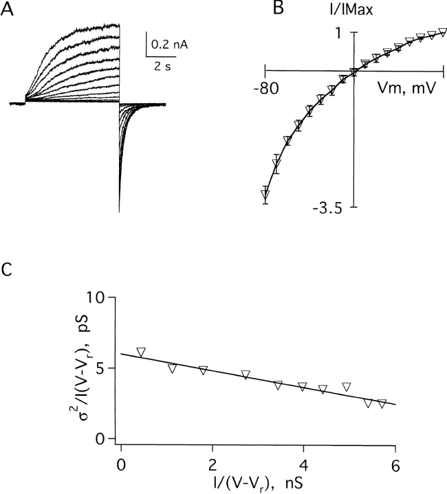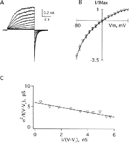 Figure 8. Current–variance relationships of IKs channels formed with S74L and D76N minK subunits. (A) Family of currents recorded from a patch excised from an oocyte coinjected with KvLQT1 cRNA and a 1:1 mixture of D76N and S74L minK cRNAs. The patch was clamped at −60 mV and depolarized from −20 to 100 mV in 10-mV steps. (B) Current–voltage relationship of peak tail currents measured for channels, mean ± SEM for three separate patches. (C) Current–variance relationship computed from the patch in A; the conductance calculated in this patch was 6.0 pS.