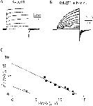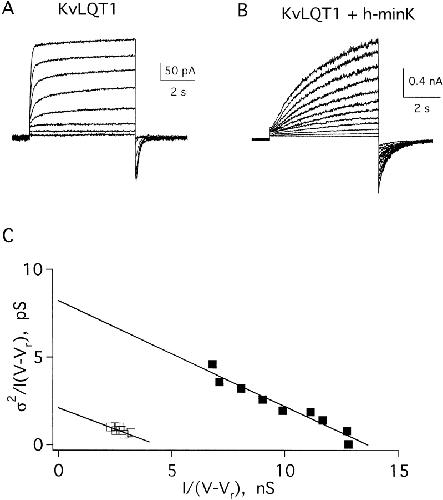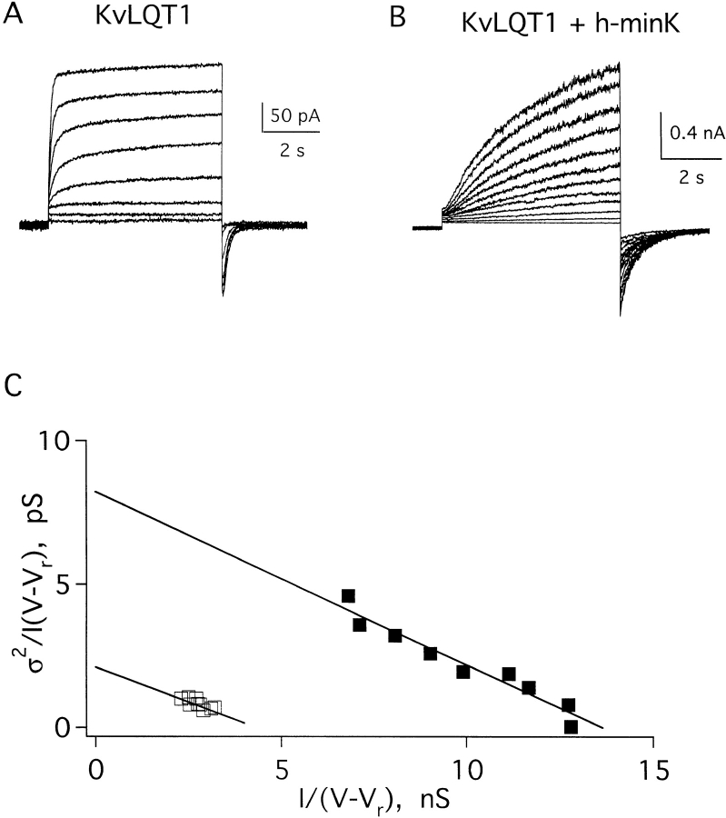 Figure 10. Currents recorded in CHO cells expressing KvLQT1 or IKs channels by whole-cell configuration. Cells were clamped to −80 mV, and then depolarized for 6 s to test potentials from −60 to 10 mV (KvLQT1) or −60 to 50 mV (IKs) in 10-mV steps. The solutions were (mM): bath: 20 KCl, 100 NaCl, 1 CaCl2, 2 MgCl2, 10 HEPES, pH 7.5; pipette: 120 KCl, 2 MgCl2, 2 EGTA, 10 HEPES, pH 7.5. (A) KvLQT1 channels. (B) IKs channels. (C) Variance–current relationships of data in A (□, KvLQT1 channels) and B (▪, IKs channels). The calculated conductances in these patches were 2.2 and 8.2 pS, respectively.